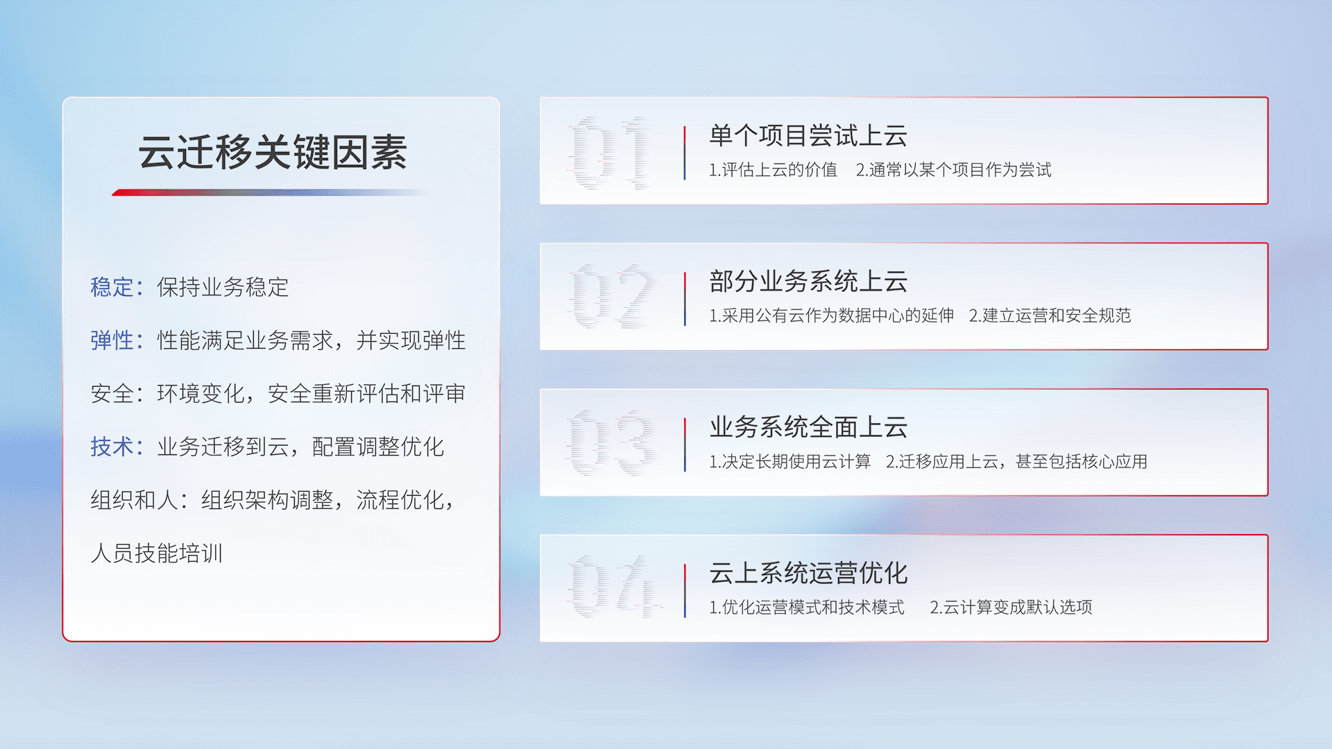 结合实际业务,,,从规划设计、、、、云平台选型、、、、云原生改造、、数据迁移、、、集成交付,,,,迁移全过程为客户识别最佳上云路径,,,做好风险识别管理,,,设计网络架构、、、身份权限、、、安全审计合规、、操作审计、、、、日志审计、、、监控告警策略、、、多站点容灾设计等,,,,对云上基础设施进行整体规划,,提升IT治理水平,,,,以满足弹性、、、高可用、、、高性能的需求。。。