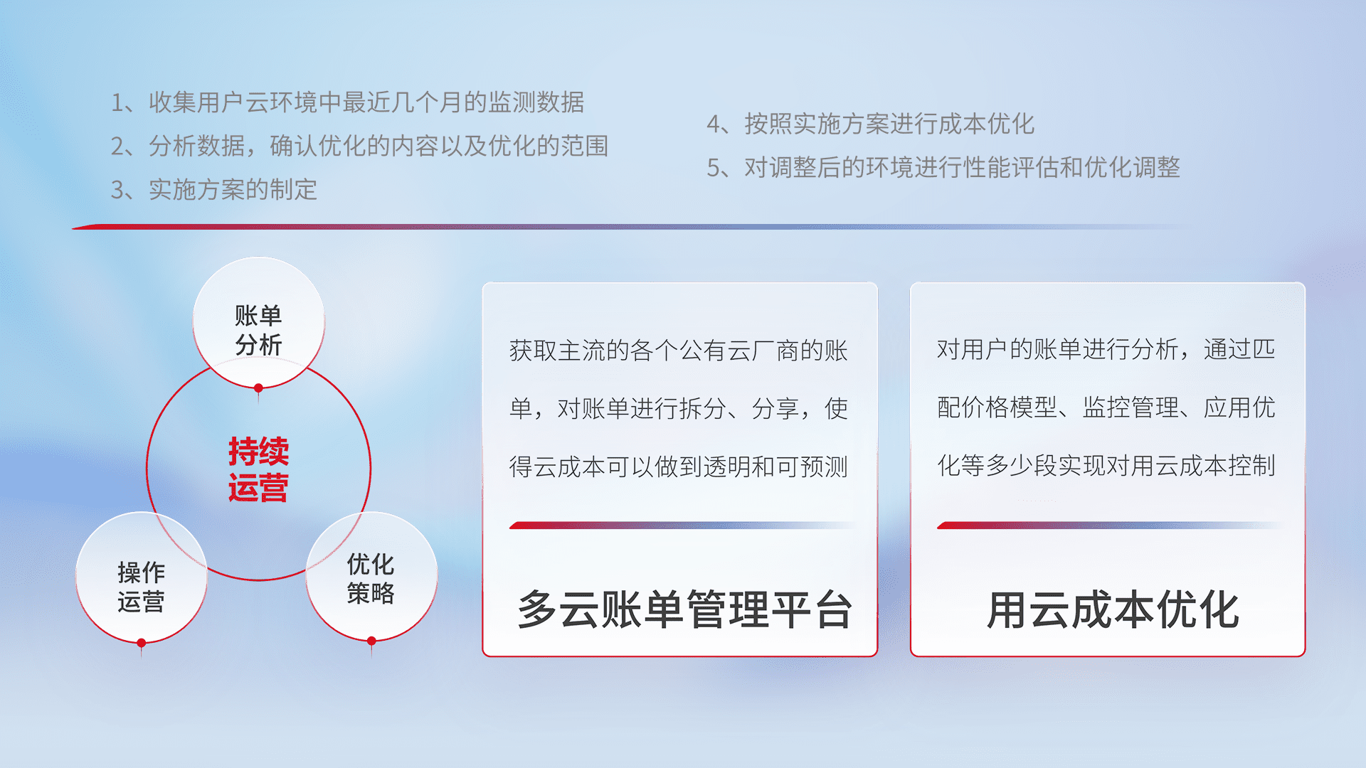 通过多云纳管,,,以统一的资源数据模型把客户的云资源进行抽象和封装,,,进而实现对多云资源的统一操作,,保障云资源管理的可靠性、、、、稳定性与可用性。。。。量身定制化运维内容,,配置、、、、开发运维、、补丁管理、、、备份、、、监控、、、、认证和访问管理、、审计和日常巡检等,,,保障在用云过程中的可靠度,,,稳定度以及高可用率。。