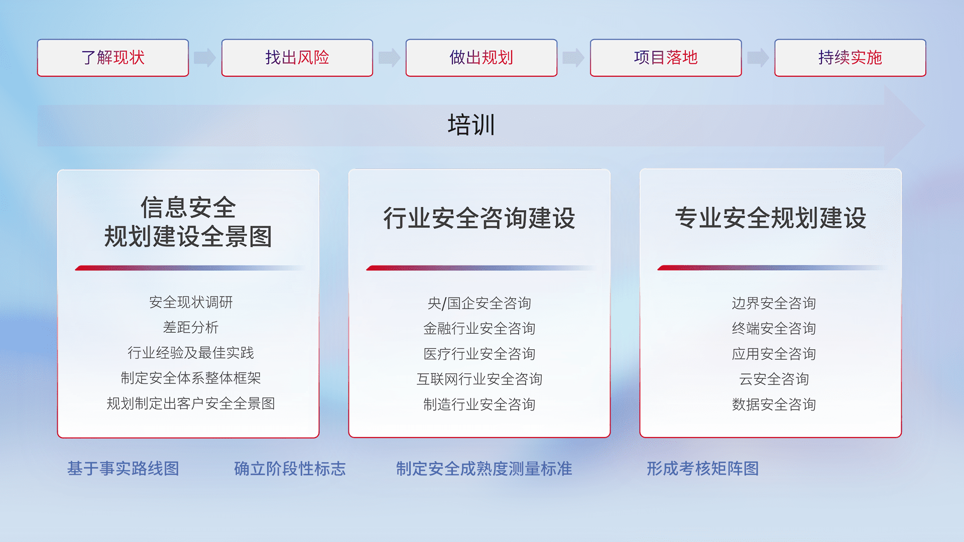 针对客户行业特性,,,,以专业的安全服务+多厂商联合解决方案提供专属的一站式安全管理服务,,帮助客户全面感知网络空间威胁,,,基于识别、、检测、、、、分析、、防护、、监测、、、响应的服务理论模型,,,,从方案咨询、、、、集成交付、、、、评估验证、、、、优化加固、、、、运维运营,,,,致力于为客户提供完整的闭环管理式安全服务。。以实战经验为客户打造高抵御风险的安全体系,,,,帮助客户发现威胁、、、对抗威胁、、、、处置威胁,,,不断积累安全对抗能力,,,持续保障数字化安全。。